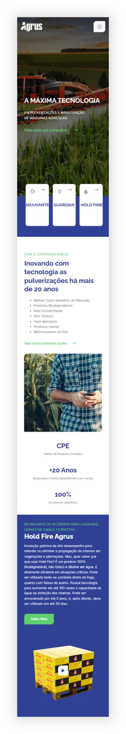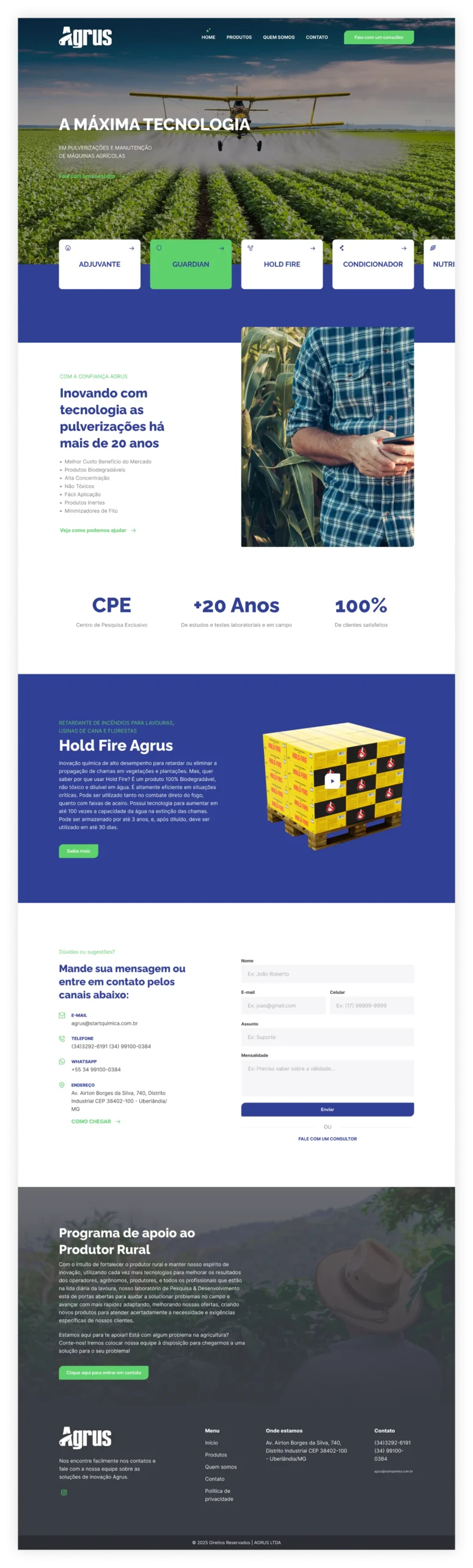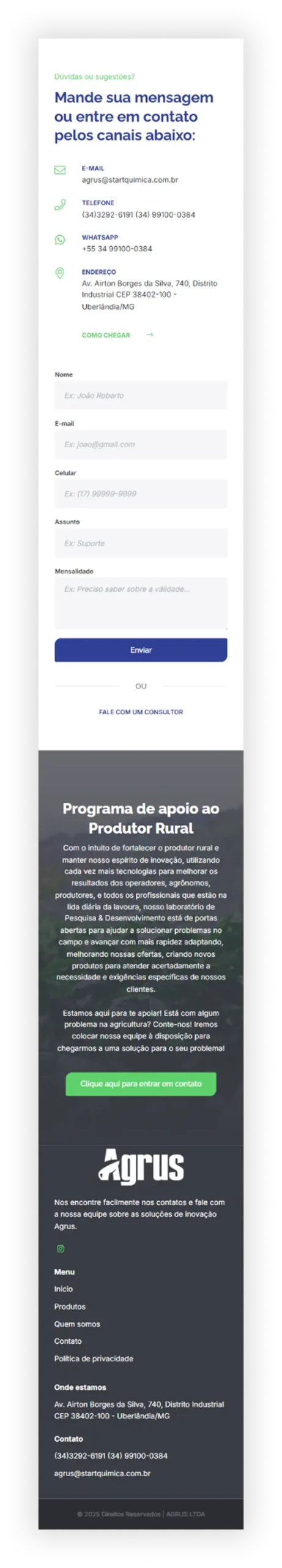 A Agrus, empresa integrante do grupo Start Química, atua no desenvolvimento de soluções voltadas ao agronegócio, entregando tecnologia, qualidade e eficiência ao produtor rural. Para fortalecer sua presença digital, estamos desenvolvendo um novo site institucional em WordPress, com foco em clareza, navegação intuitiva e valorização das linhas de produtos. O projeto está em produção, com lançamento previsto para 2026.