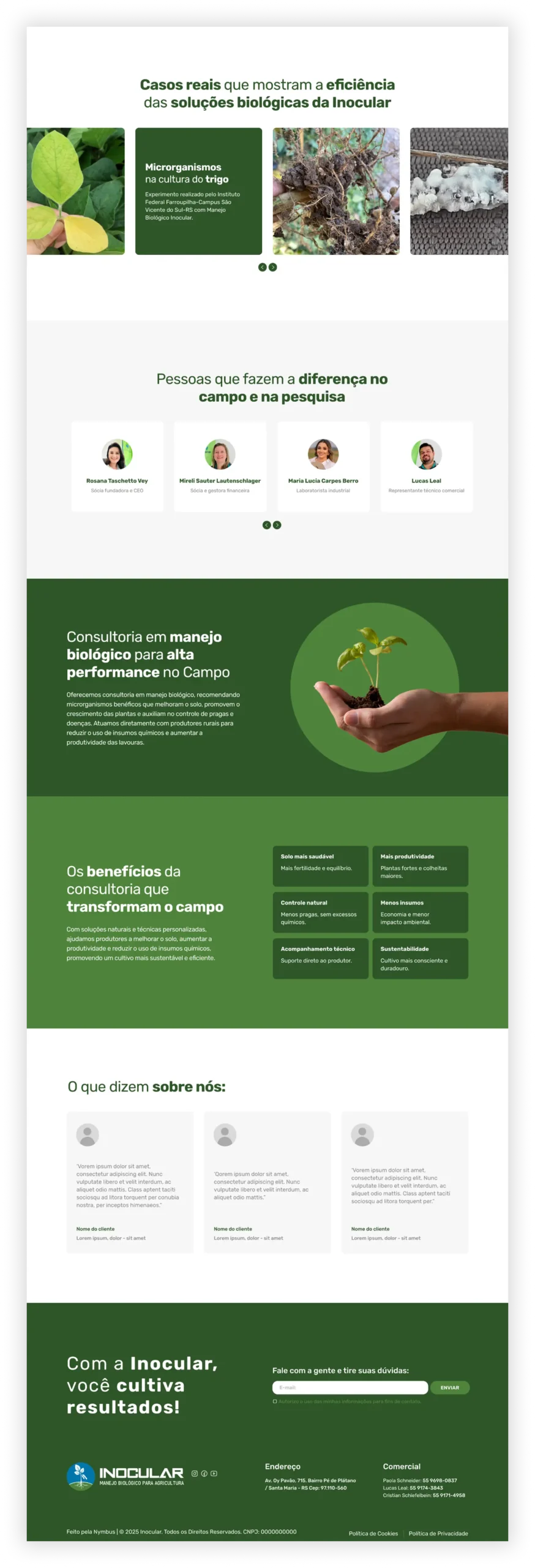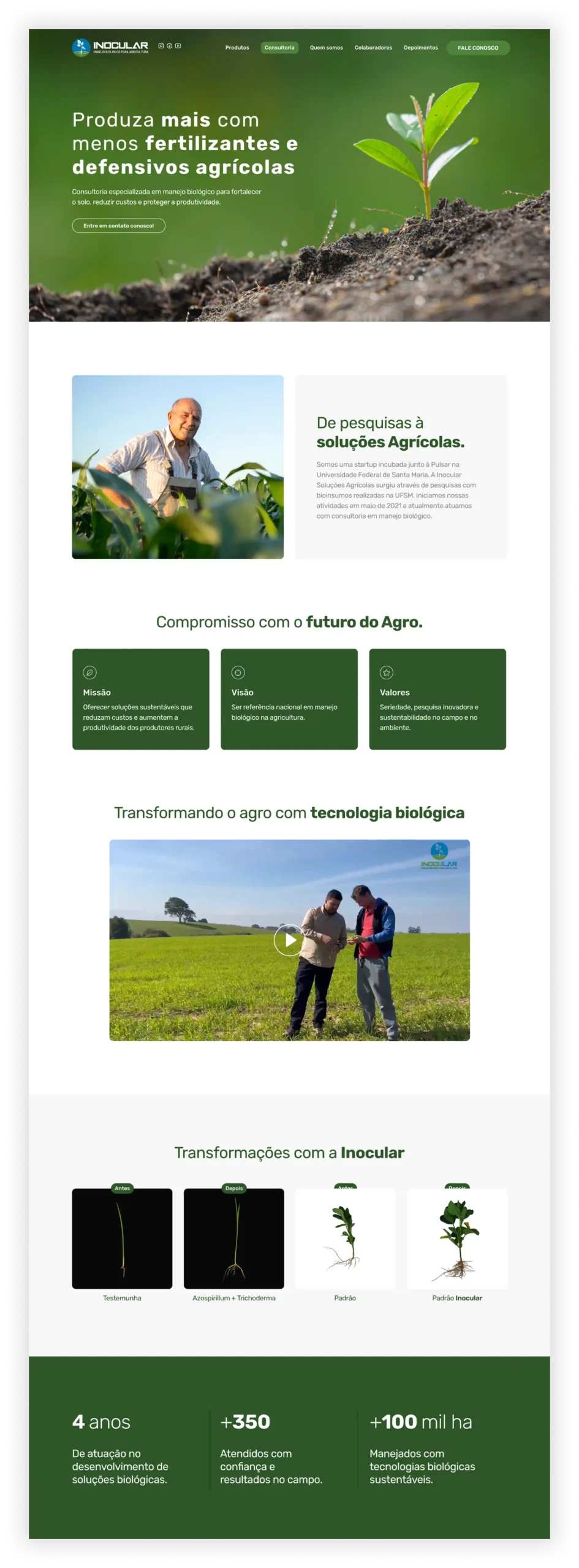 Para a Inocular, especialista em consultoria de manejo biológico, desenvolvemos um site one Page claro, apresentando seus serviços de forma objetiva e profissional. A estrutura destaca os benefícios do manejo biológico — produtividade, solo equilibrado e redução de insumos químicos — além de reforçar o suporte técnico ao produtor rural. Um projeto pensado para comunicar valor, fortalecer a presença digital e apoiar futuras ações de marketing.