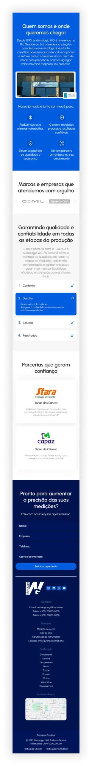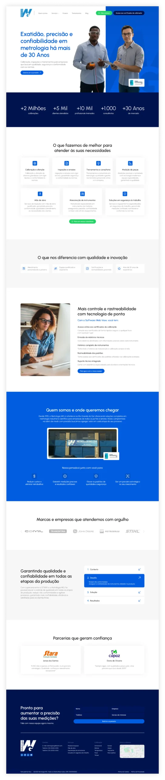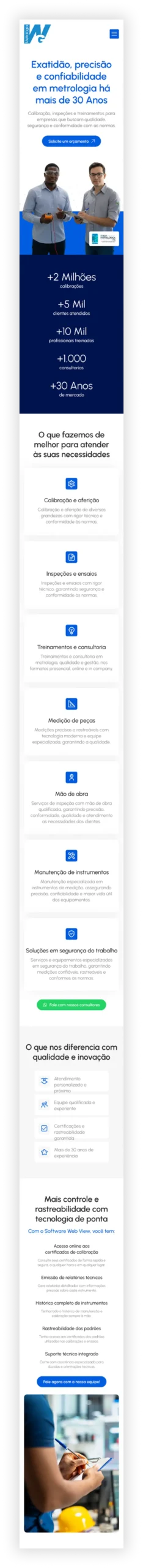 Para a Metrologia WG, referência em metrologia no RS desde 1995, desenvolvemos um site institucional com homepage clara e de fácil navegação, além de páginas específicas para cada grandeza de calibração. A estrutura foi pensada para atender diferentes segmentos e auxiliar em futuras campanhas direcionadas.