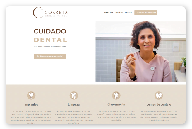 Correta odonto é uma clínica odontológica localizada na região central de Porto Alegre com foco em um atendimento personalizado e de qualidade e precisavam de um site para iniciar com as campanhas no google. Criamos então um site com um layout minimalista e com design elegante focado na fácil navegação do usuário e com call-to-actions bem distribuídas pelo site para facilitar o contato dos leads que entram pelas campanhas.
